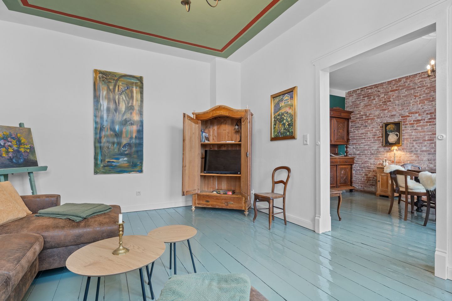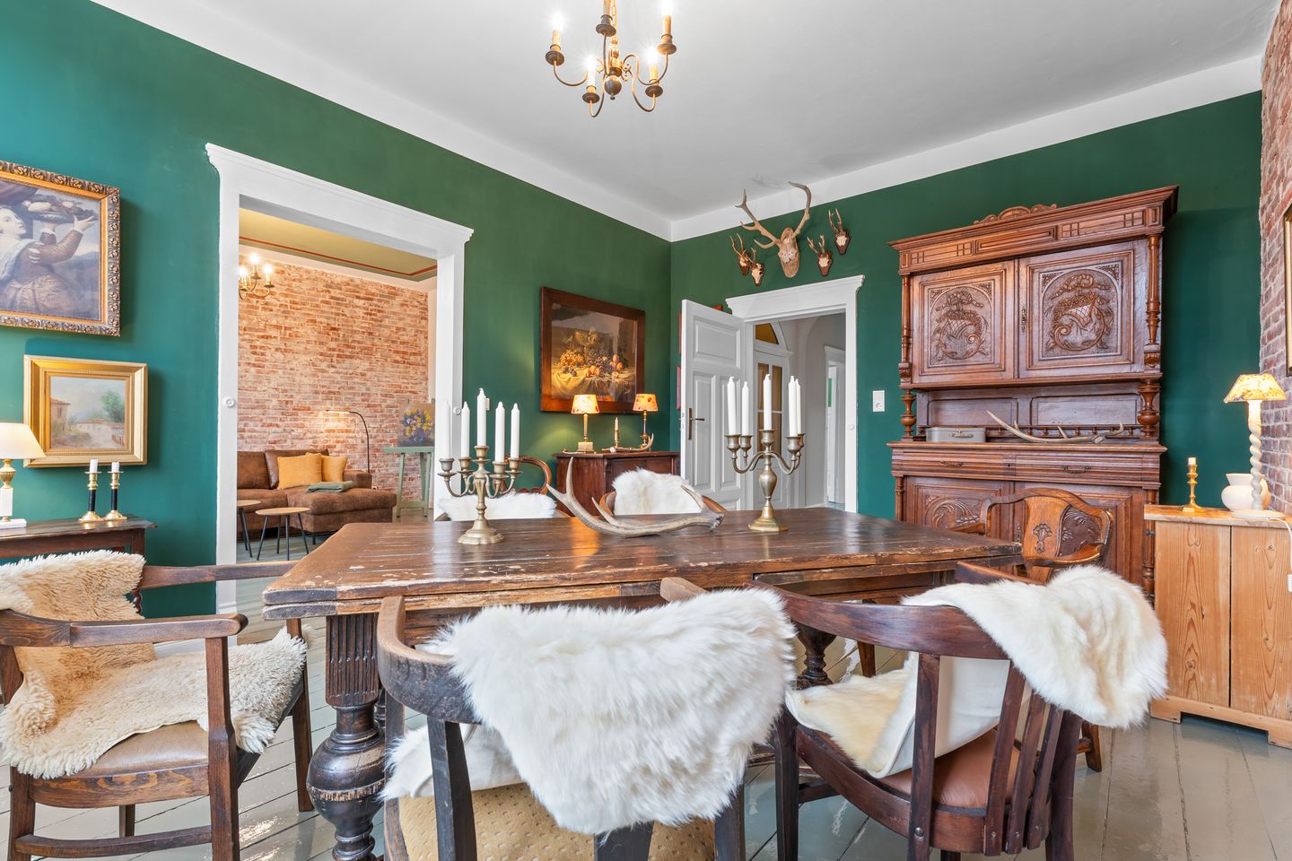 Das unbestrittene Herzstück der BELETAGE ist das klassische Jagdzimmer. Mit seinem großen Esstisch lädt es zum gemeinsamen Essen, zu langen Gesprächen und geselligen Abenden ein. Von hier öffnet sich der Raum in das moderne Wohnzimmer mit freigelegter Steinwand – eine gelungene Verbindung von Geschichte und Gegenwart. Ein großes, gemütliches Sofa bietet Platz zum Entspannen; der Smart-TV ist dezent im Schrank verborgen.