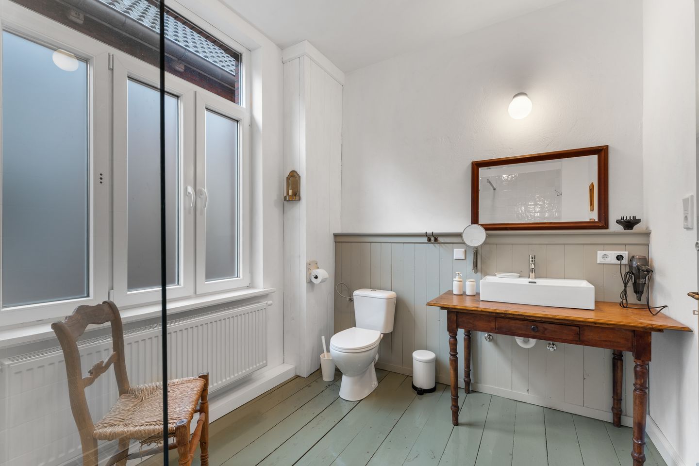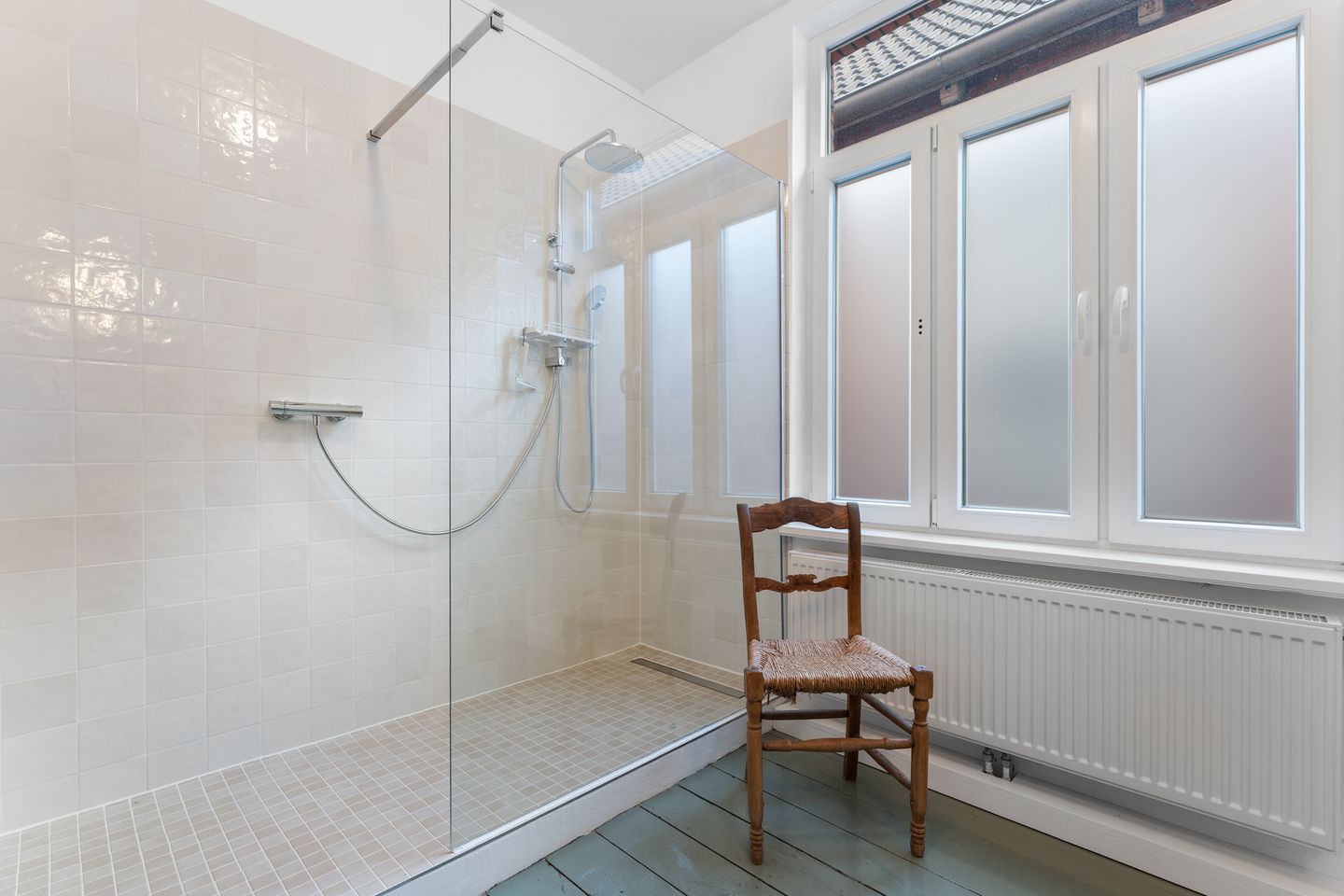 Das Badezimmer ist modern und durchdacht: eine große, begehbare Dusche mit clever installierter Armatur, die sich bedienen lässt, ohne dass man gleich nass wird – für einen entspannten Start in den Tag. Föhn und Kosmetikspiegel sind selbstverständlich vorhanden.