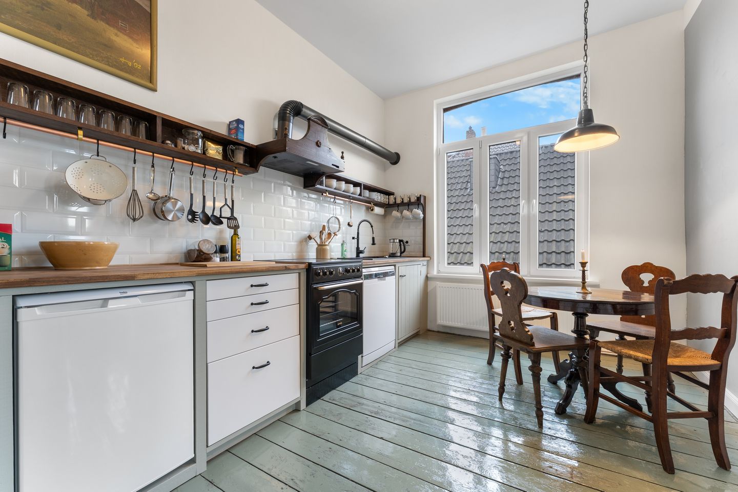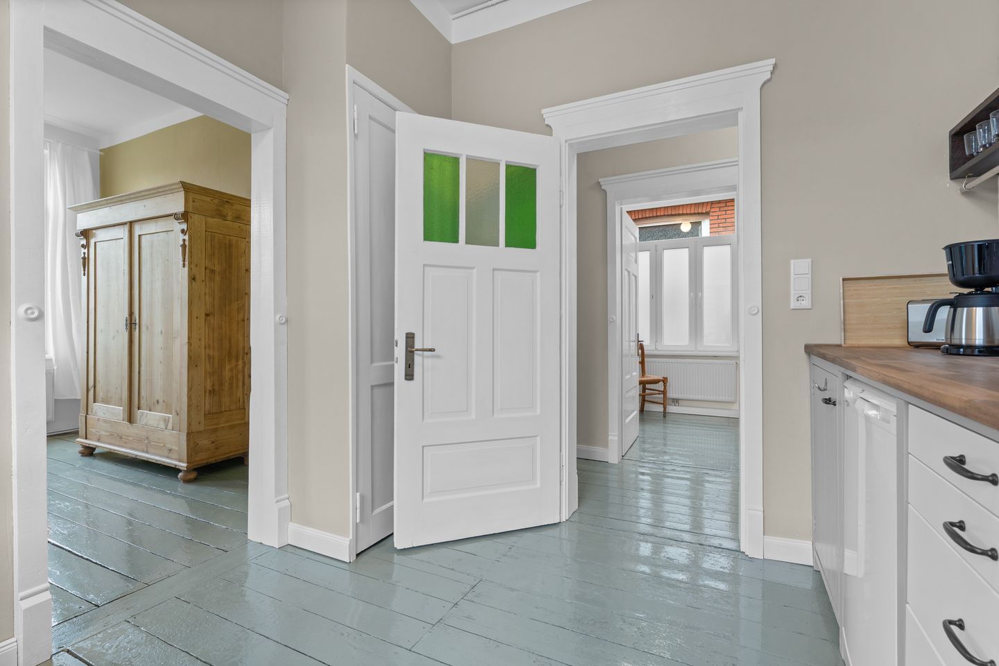 Die Küche verbindet Funktionalität mit Charme. Sie bietet zahlreiche Annehmlichkeiten und überrascht mit liebevollen Details, wie etwa einer Abzugshaube, deren Front dem typischen Greetsieler Giebel nachempfunden ist und aus Teilen einer alten Kommode gefertigt wurde. Überhaupt dominieren antike Möbel und ausgewählte Einzelstücke die gesamte Wohnung und verleihen ihr Seele und Charakter.