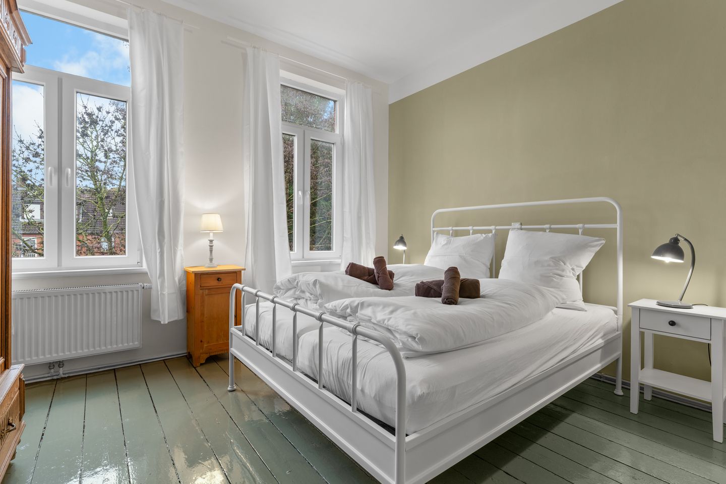 Die zwei gartenseits gelegenen Schlafzimmer sind ruhig, stilvoll und komfortabel gestaltet. Jedes verfügt über ein Doppelbett mit Einzelmatratzen, antike Holzkleiderschränke sowie passende Nachttische mit Beleuchtung. Verdunkelungsvorhänge sorgen für erholsamen Schlaf - ganz gleich zu welcher Tageszeit.